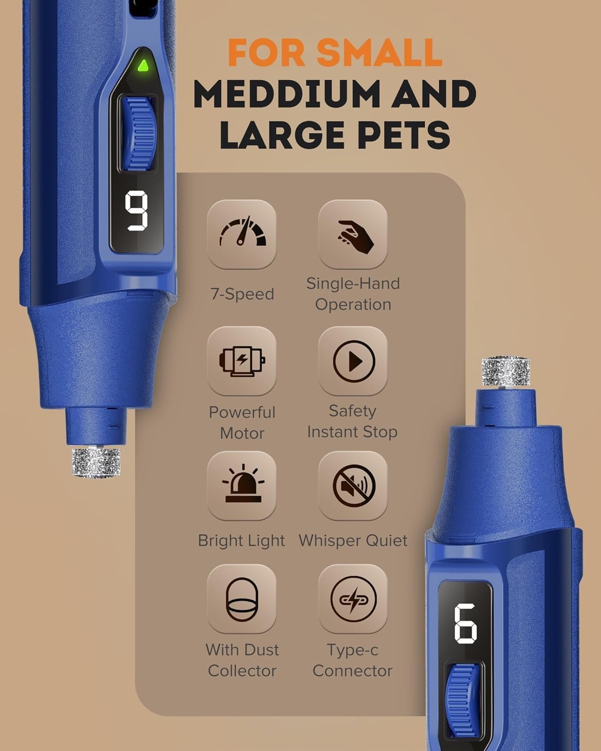 • INCLUDES DUST COLLECTOR: No more mess! The dog nail grinder features a built-in dust collector to keep nail filings contained, providing a tidy grooming session for both you and your pet.